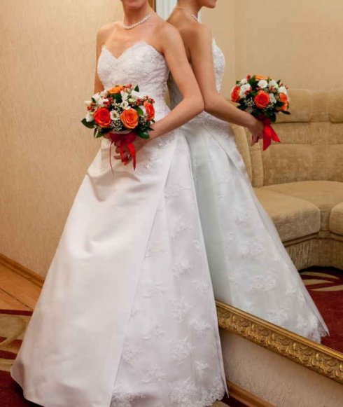 Продам яркое белое свадебное платье, р-р 42-44, рост 170. Женственный корсет А-силуэта без бретелек, на шнуровке, с красивой вышивкой и мягкой драпировкой идеально держится на фигуре. Идеально подходит для торжества как в летний, так и в прохладный сезон в сочетании с меховым манто. Платье не требует использования дополнительных подъюбников, не было в прокате, одето 1 раз. Бижутерия и чехол – в подарок.